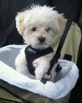 We are totally in love with our Spanky. Now 14 weeks and still a joy for us. He is so good, listens well. Wee Wee pad trained with only 3-4 accidents since we got him at 9 weeks. He knows sit, stay and come. He has just stated walking with a harness and leash with no issues. This pic shows him in his booster seat on the way to the vet. Best gift he has gotten, he sits so well in the seat.